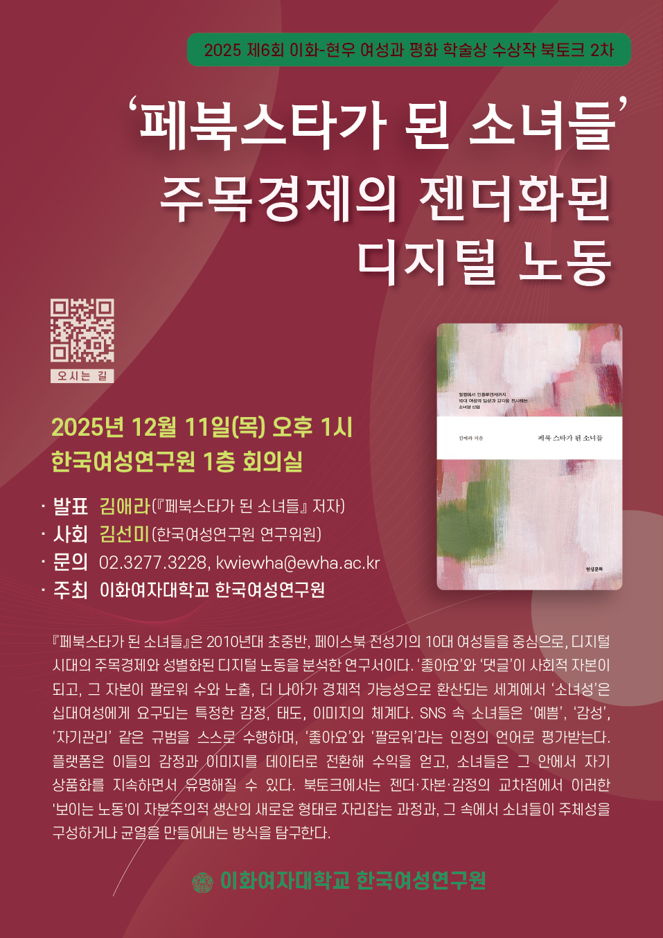 [학술/연구] [한국여성연구원] 2025 제6회 이화-현우 여성과 평화 학술상 수상작 북토크 2차: 페북스타가 된 소녀들