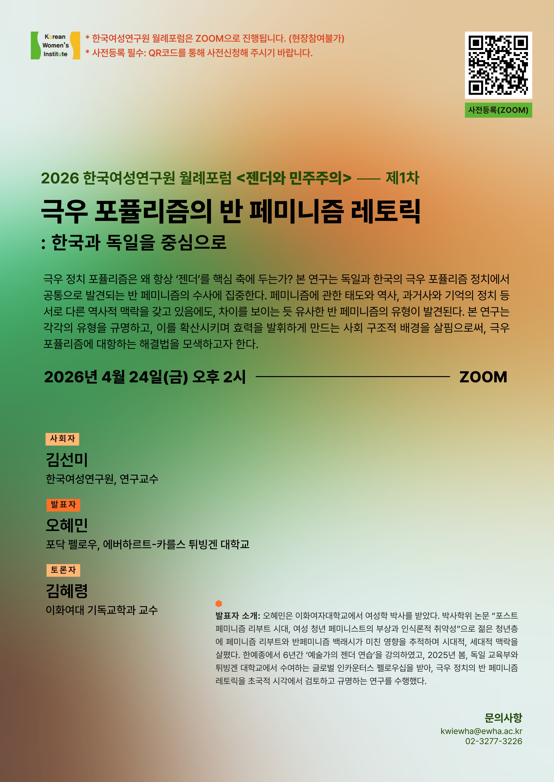 [학술/연구] [2026 한국여성연구원 월례포럼 '젠더와 민주주의' 제1차] 극우 포퓰리즘의 반 페미니즘 레토릭: 한국과 독일을 중심으로