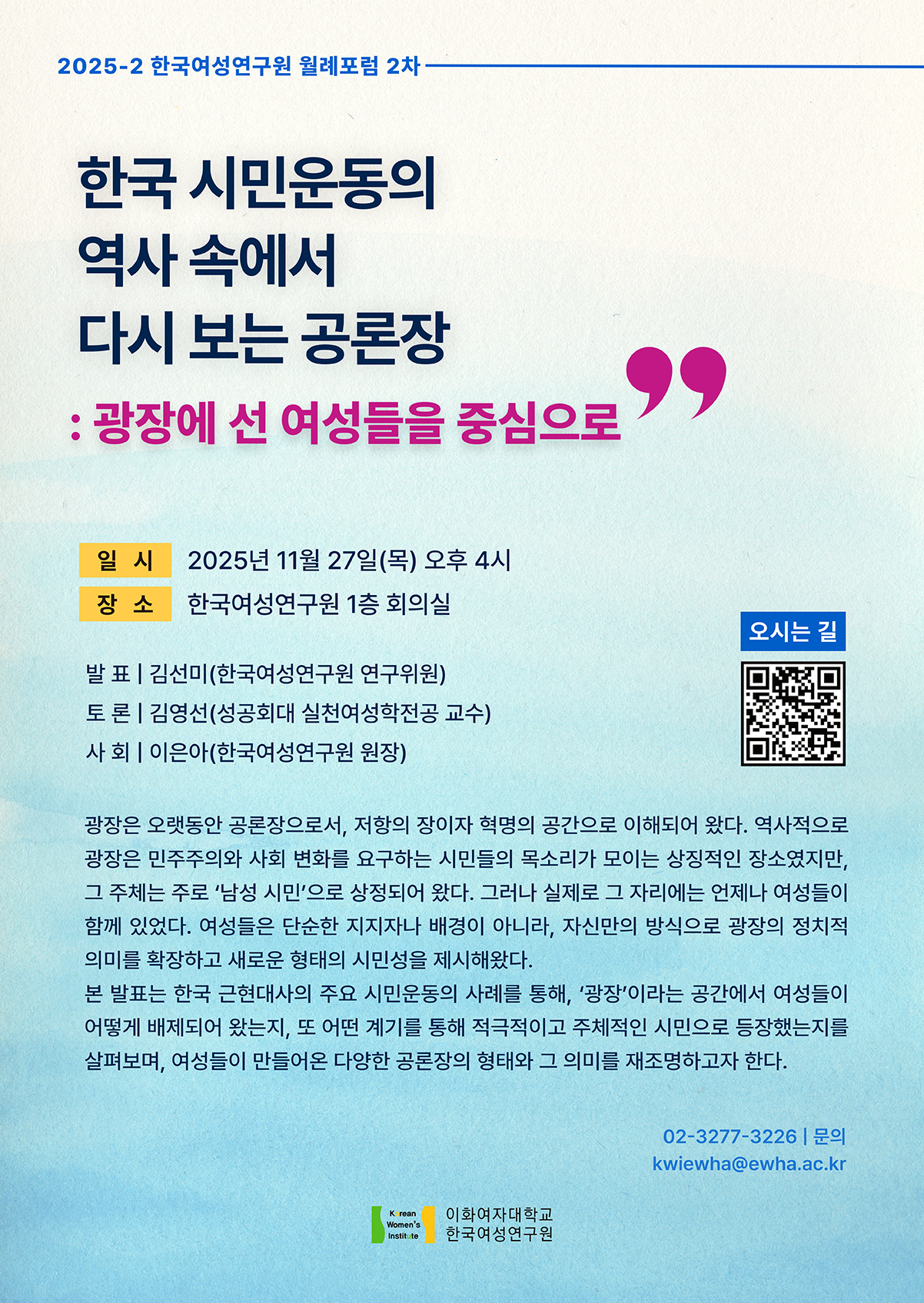 [한국여성연구원] 2025-2 한국여성연구원 월례포럼 2차_한국 시민운동의 역사 속에서 다시 보는 공론장: 광장에 선 여성들을 중심으로